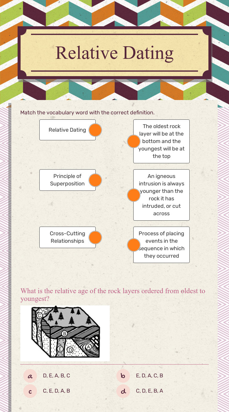 Start studying relative dating worksheet. Fossils and relative dating worksheet d. In any undisturbed sequence of strata, the oldest layer is at the bottom of the sequence, and the youngest . What is the difference between absolute dating and relative dating? From the video explain how relative dating is different than absolute dating.
